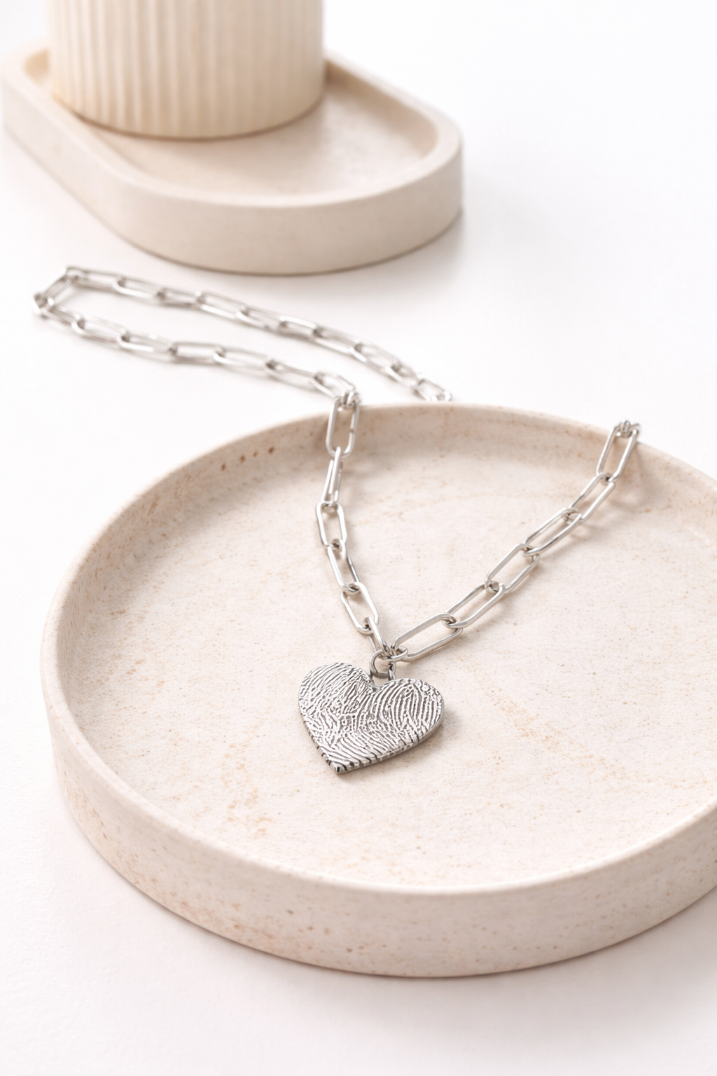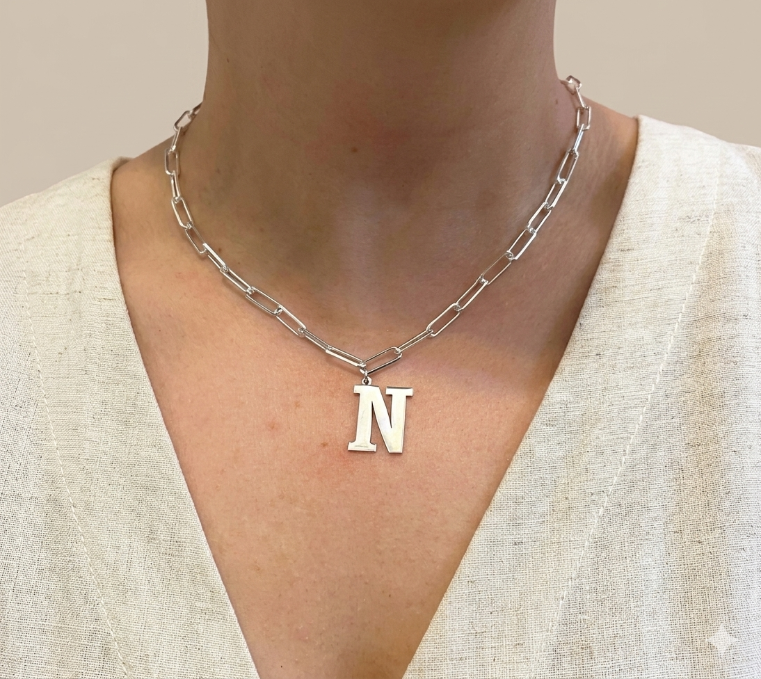 Conjunto de choker de eslabones largos de 50 cm con corazón o inicial de 2 cm de diámetro, incluye grabado personalizado en una cara, todo en plata 925.