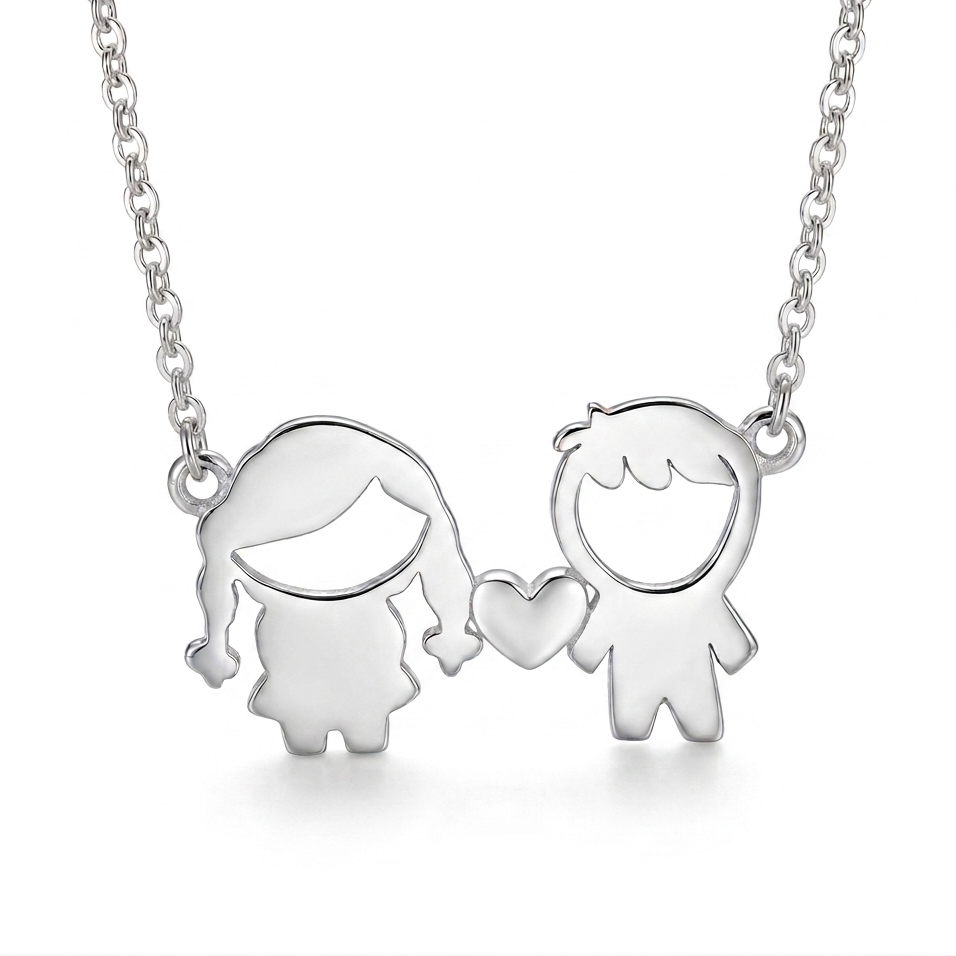 Collar con niña-corazón-niño en plata 925 con cadena rolo fina de 45 cm.